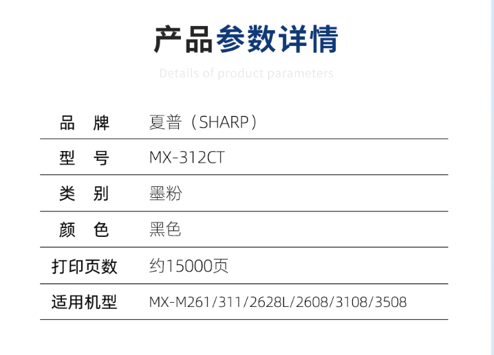 參數(shù) [品牌] 夏普 [型號] 夏普(SHARP)MX-312CT墨粉盒 15K (適用MX-M261/311/2628L/2608/3108/3508機型)