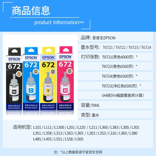 參數(shù) [品牌] 愛普生 [型號(hào)] 愛普生原裝672墨水四色墨水